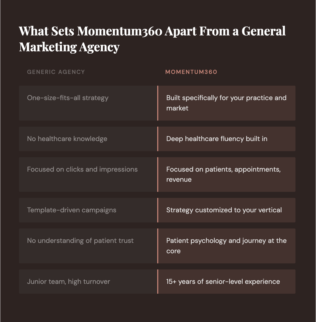 Generic marketing agencies can run ads and post on social media. What they can't do is understand why a patient chooses one practice over another, what builds real trust in a healthcare context, or how to communicate value without crossing compliance lines.